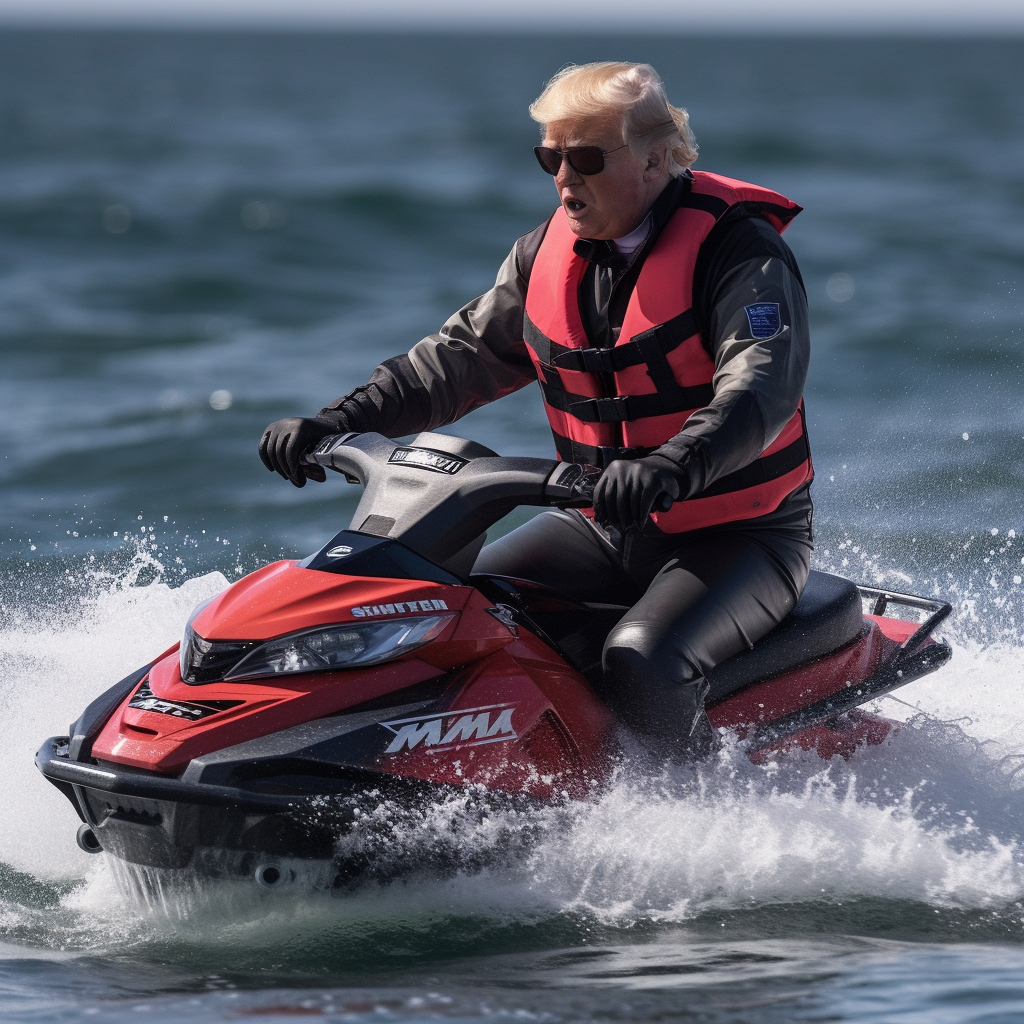 As Trump deftly maneuvered his aquatic steed through the choppy waters, he was overheard shouting catchphrases such as, “You can’t indict the wind!” and “I am the storm!” His impromptu joyride climaxed as he executed a triumphant loop around the iconic Statue of Liberty, almost as if to remind the world that freedom isn’t just about unalienable rights but also about jetski-based shenanigans.