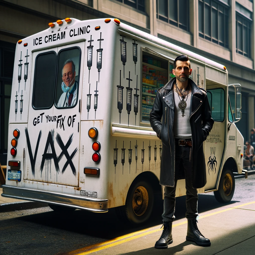 Jerry’s mix-up occurred at an underground clinic that had all the legitimacy of a back-alley Rolex vendor. The “clinic,” a repurposed ice cream truck adorned with Sharpie-drawn syringes and the words “Get Your Fix of Vax,” was manned by a dude named Spike—clearly, a medical professional who had swapped his white coat for a leather jacket and his Hippocratic Oath for a “Hypodermic Promise.”